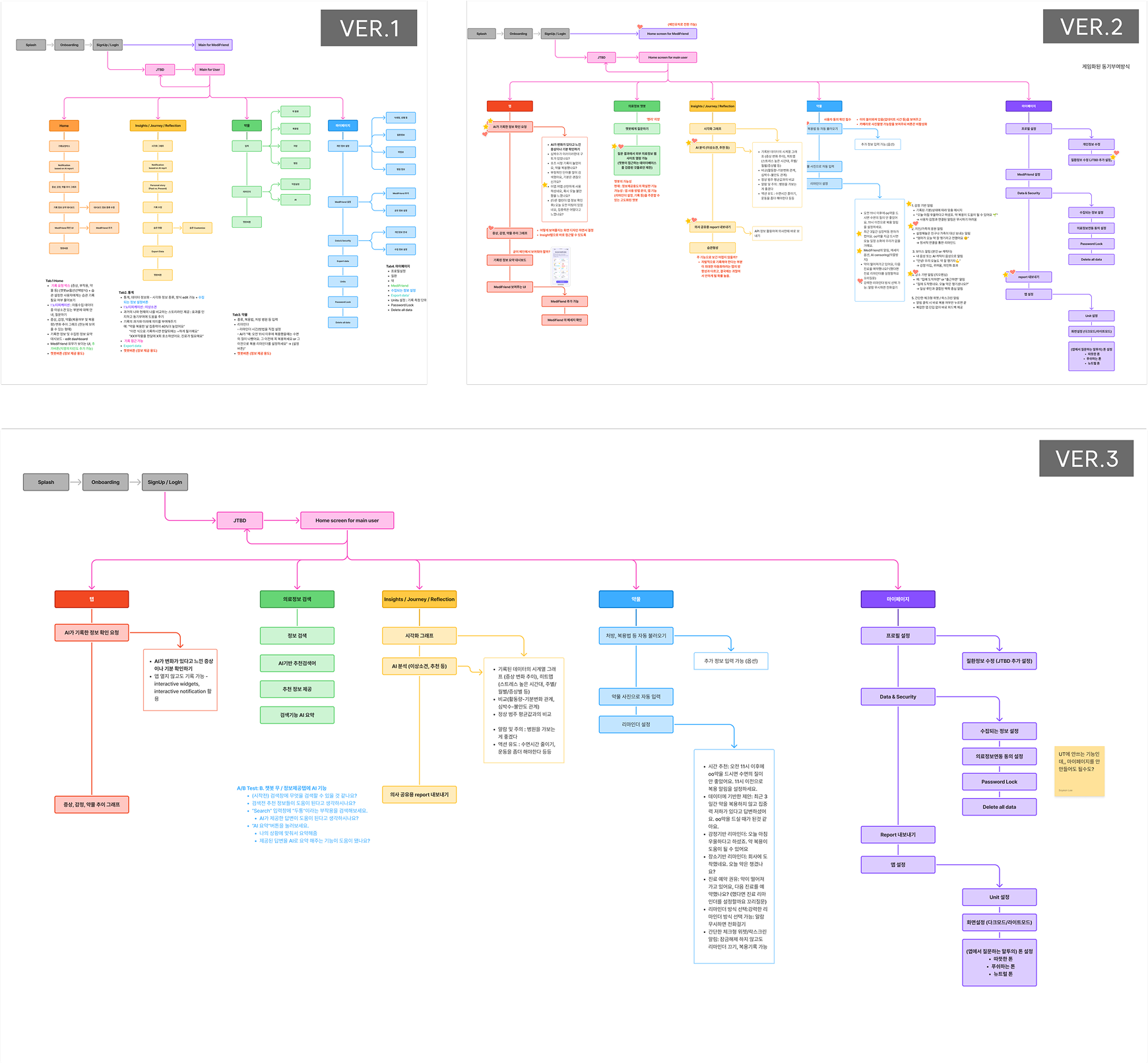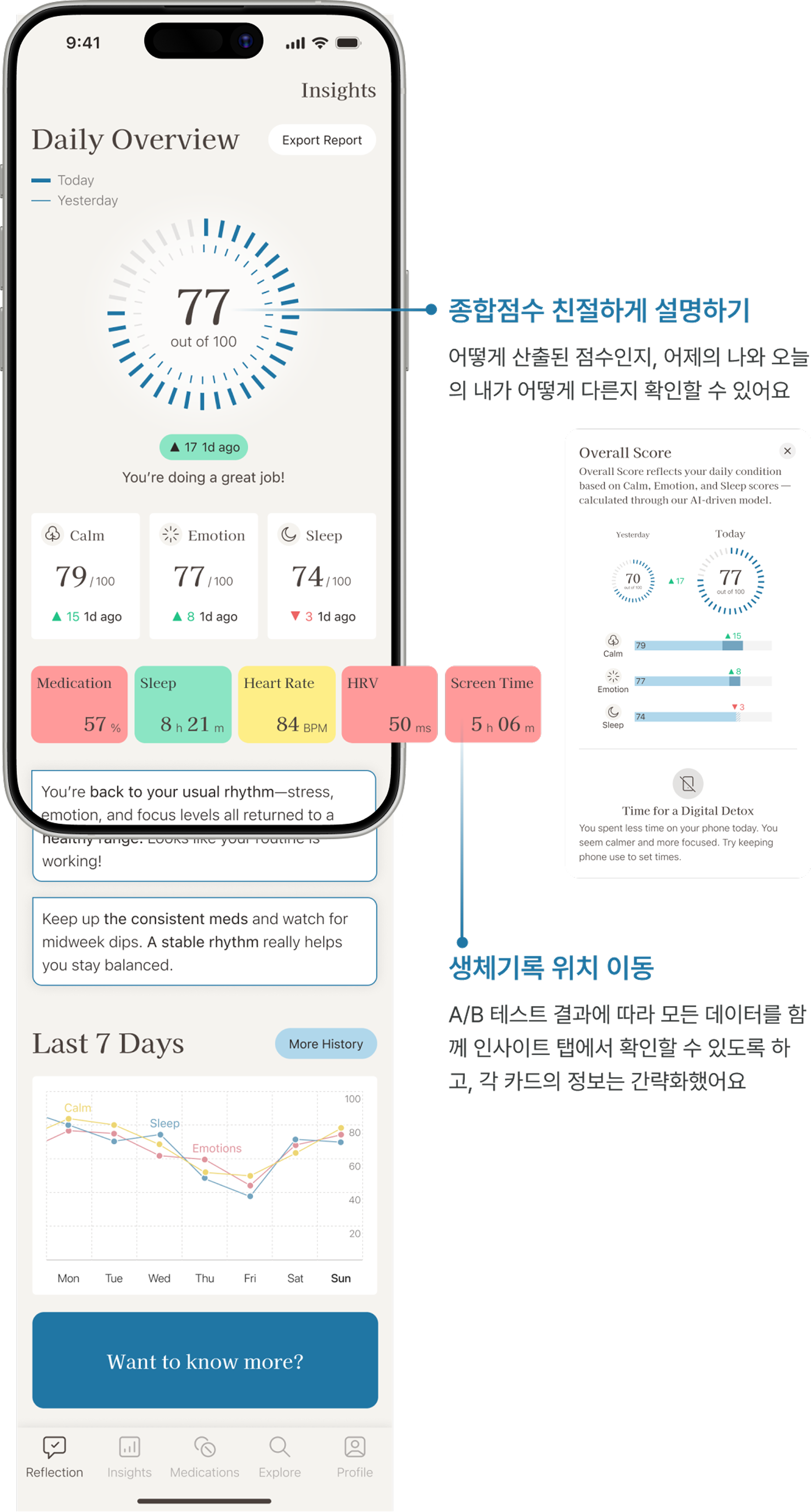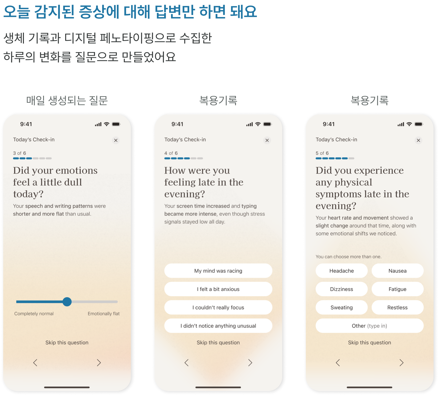 다음 단계로 사용자 일방의 입력을 넘어 일상 속에서 자연스럽게 기록이 이어지도록 유도하는 경험을 도입하고 싶습니다. 웨어러블 기기와의 연동이나, 사용자 상태 기반의 기록 제안 기능을 통해 기록의 부담은 줄이고 지속적인 경험을 이끌고 싶습니다.