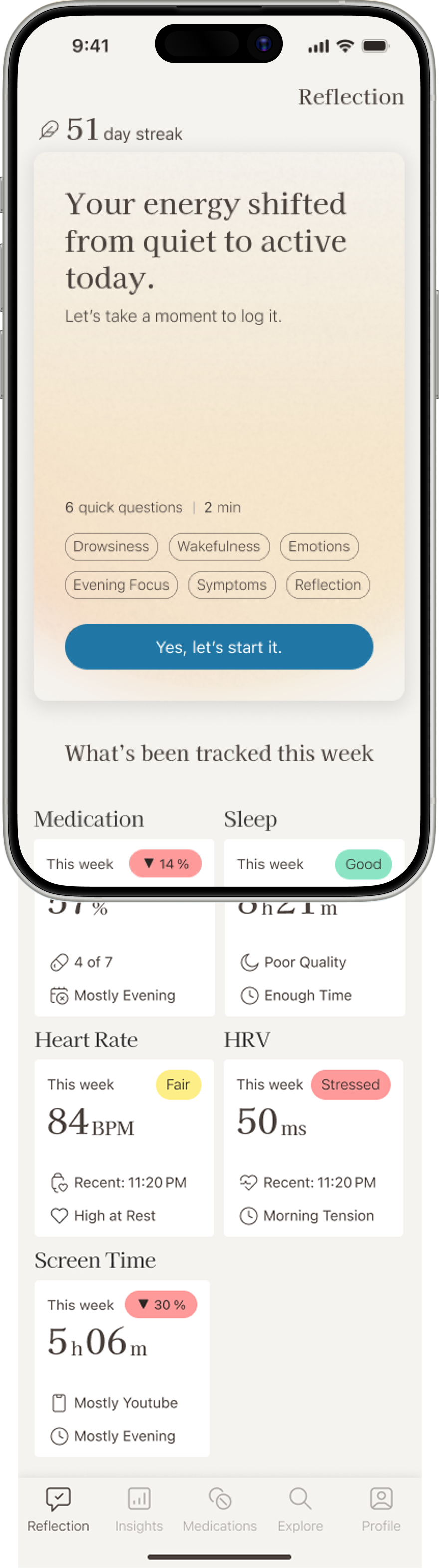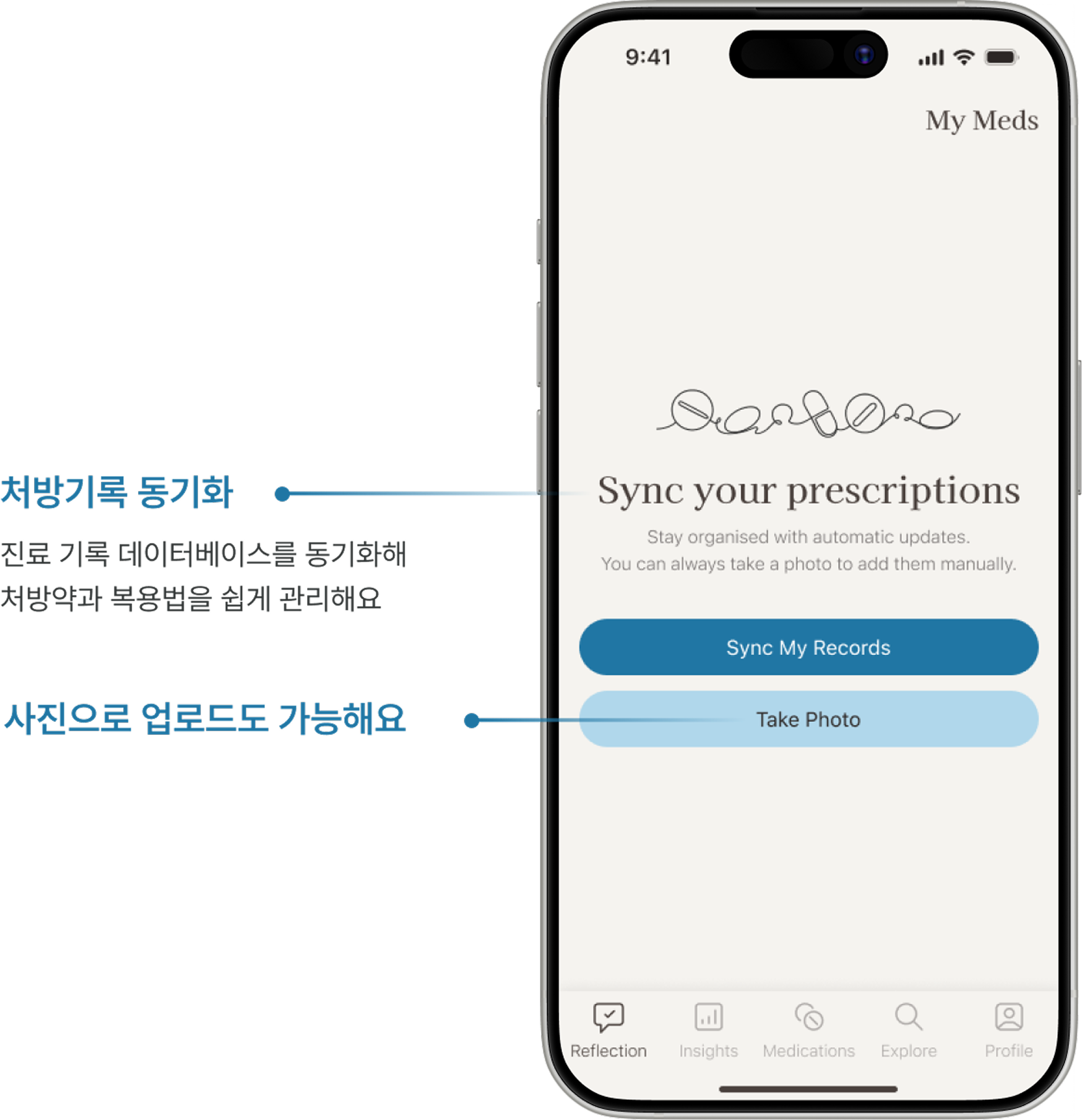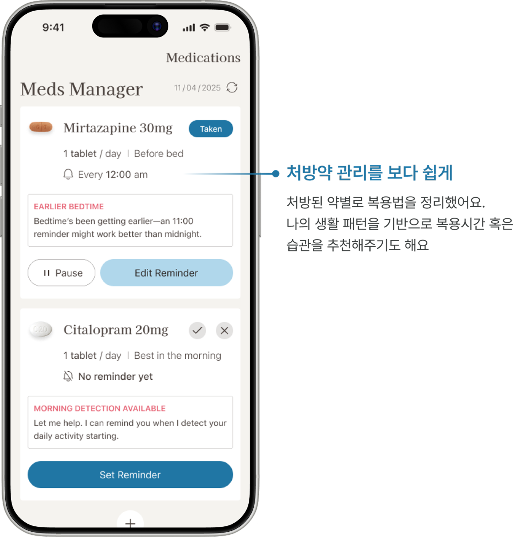 다음 단계로 사용자 일방의 입력을 넘어 일상 속에서 자연스럽게 기록이 이어지도록 유도하는 경험을 도입하고 싶습니다. 웨어러블 기기와의 연동이나, 사용자 상태 기반의 기록 제안 기능을 통해 기록의 부담은 줄이고 지속적인 경험을 이끌고 싶습니다.